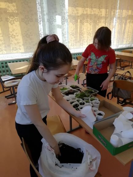 Девочки 6 класса выращивают посадочный материал для озеленения территории возле памятника погибшим односельчанам и готовятся к акции экодар "Цветы детям войны".