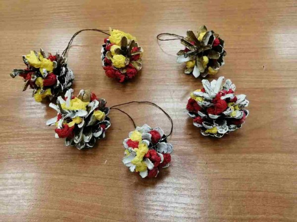 Цель - содействие формированию у детей ответственного и бережного отношения к природным богатствам родного края, повышению творческой активности, развитию наблюдательности. Чтобы нарядить лесную красавицу, необязательно использовать покупные игрушки, а можно сделать из обычной шишки. Ребята с увлечением вовлеклись в творческую работу и у них получились замечательные новогодние игрушки.