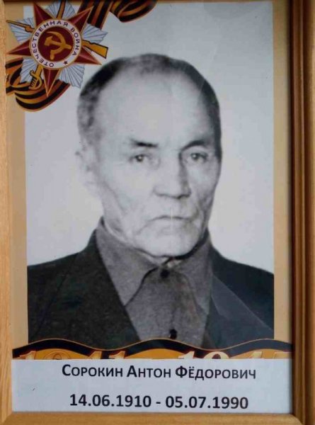 Сорокин Антон Федорович (14.06.1910 - 05.07.1990) в июле 1941 года был мобилизован Олонецким РВК в 144 стрелковый полк. Служил в звании красногвардейца, гвардии рядового. За годы Великой Отечественной войны был трижды ранен.