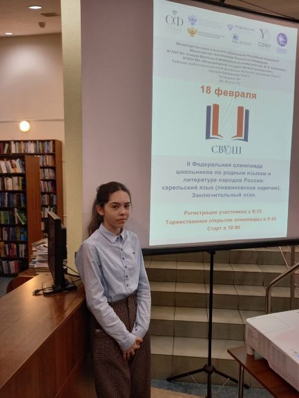 18 февраля, в ПетрГУ прошел заключительный этап II Федеральной Олимпиады школьников по родным языкам и литературы народов России: карельский язык (ливвиковское наречие). Нашу школу представляла ученица 9 класса Романова Карина. Результаты пока неизвестны, но Карина МОЛОДЕЦ! В такой Олимпиаде мы участвуем впервые.
