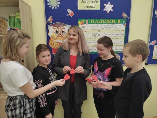 С 12 по 16 февраля в нашей школе проводится Неделя начальных классов. В рамках недели прошли открытые уроки, мастер-классы, викторины, акции. Ребята участвовали в акции "Подари сердечко" , цель акции: формирование у обучающихся сплочённости, укрепление связей внутри школьного коллектива, формирование уважения к учителям и получения положительных эмоций. 12 февраля ребята 2-4 классов приняли участие в мастер-классе "Открытка солдату", приуроченном ко Дню защитника Отечества.