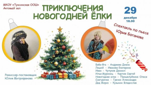 В программе: премьера спектакля по пьесе Юрия Боганова Приключения Новогодней елки, концертная программа и новогодняя дискотека.