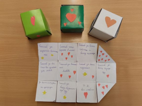 22 декабря 2022 года в рамках Всероссийского праздника благодарности родителям «Спасибо за жизнь» обучающиеся 5 класса МКОУ «Туксинская ООШ» совместно с советником директора по воспитанию Ивановой Е.М. изготовили для родных открытки с теплыми словами.