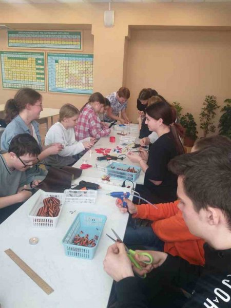 Обучающиеся 8 класса с классным руководителем Чупуковой Н.Н., с советником директора по воспитанию Ивановой Е.М. изготовили 35 декоративных брошей с использованием символа Дня Победы - Георгиевской ленты.