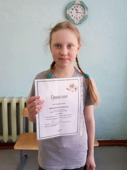 Яковлева Анастасия, обучающаяся 4 класса, заняла первое место в XII районной олимпиаде обучающихся начальных классов по русскому языку. Молодец!